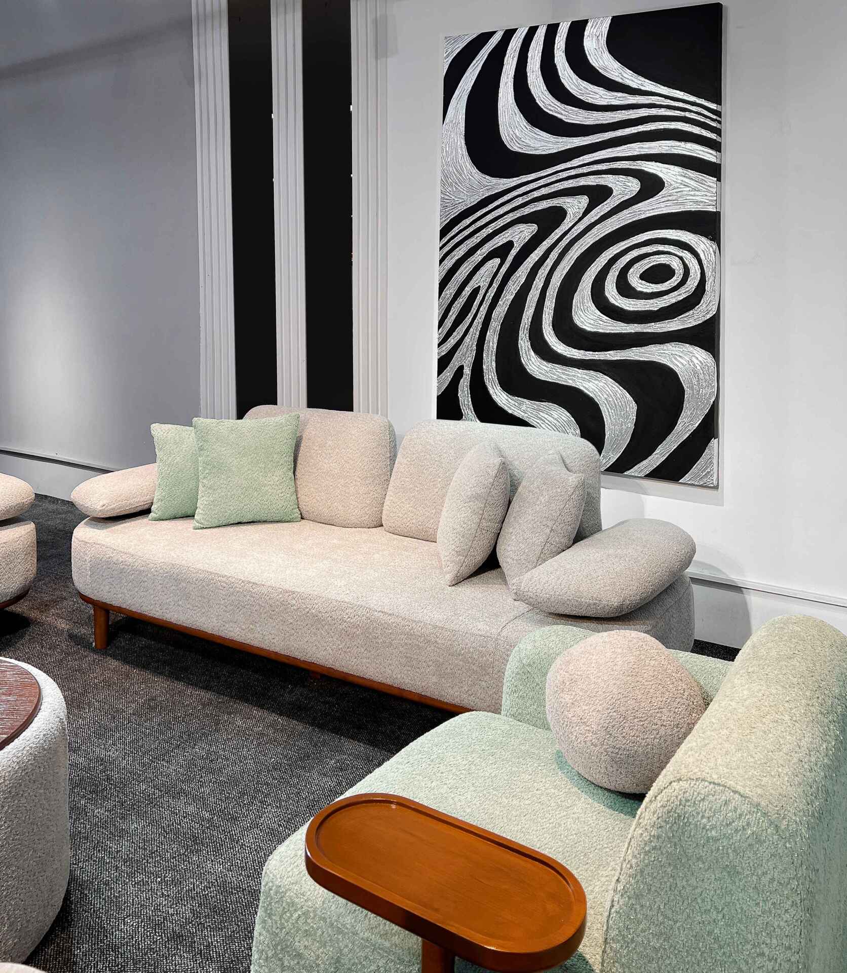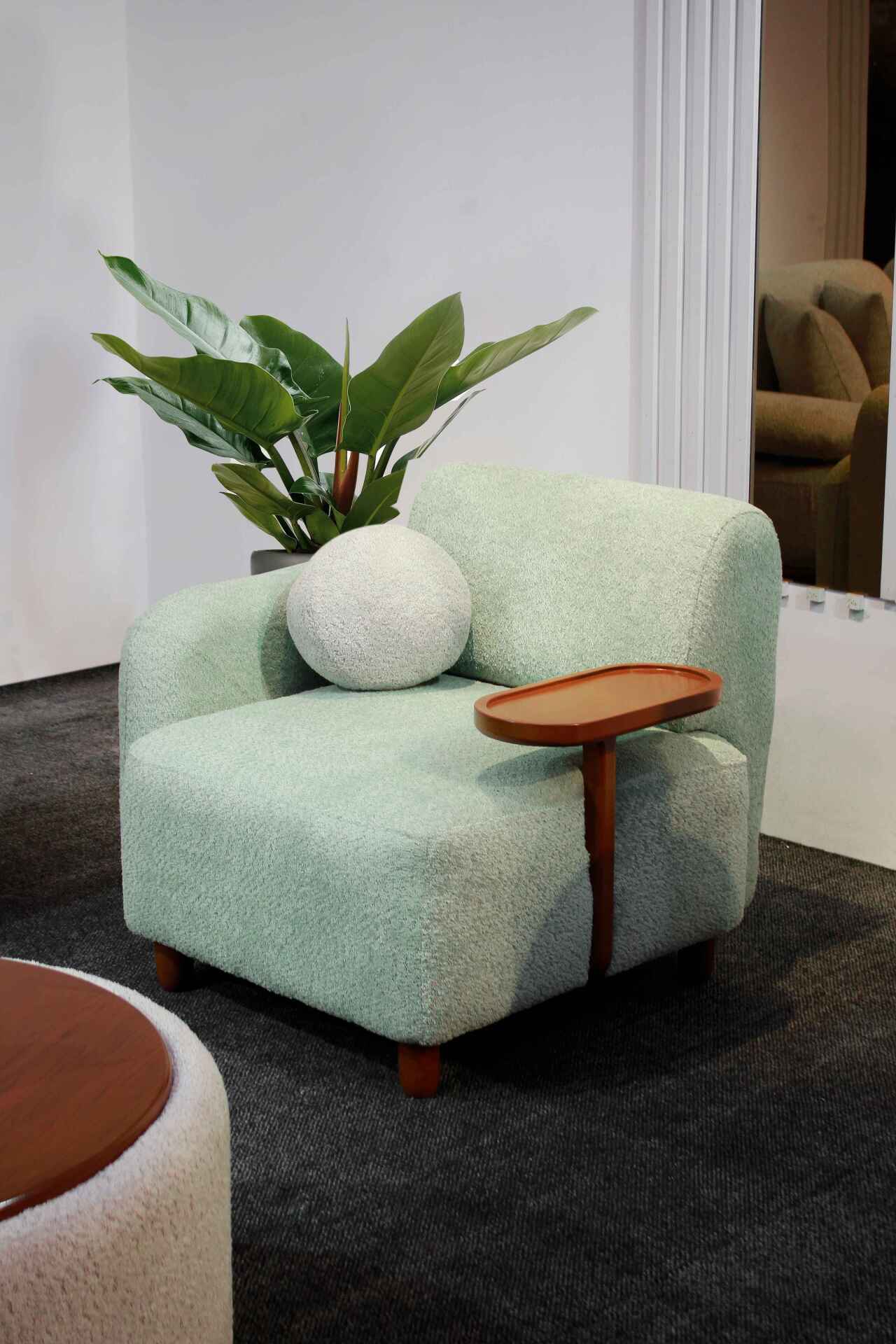 مبلی مدرن و خلاقانه با طراحی نرم و منحنی، ترکیب پارچه بافتدار و چوب طبیعی.